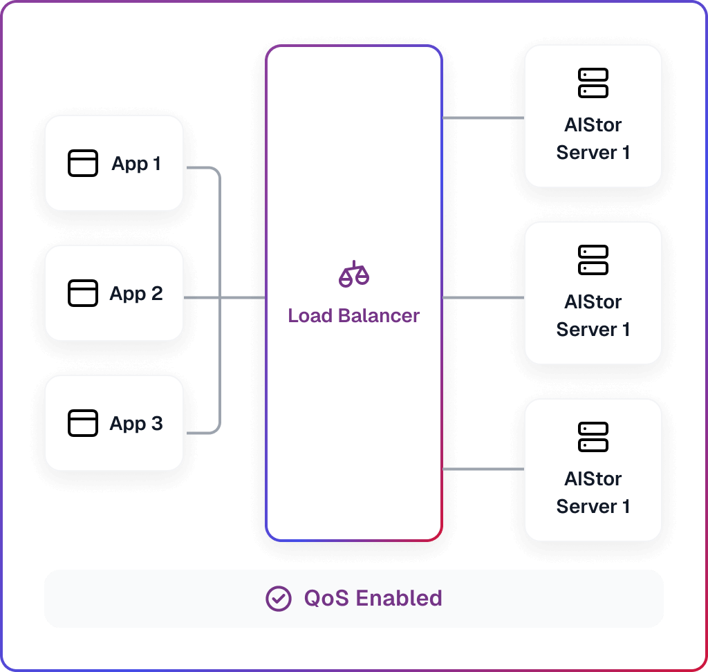 MinIO AIStor delivers distributed client-side load balancing and bucket-level Quality of Service (QoS), eliminating central bottlenecks while ensuring predictable performance, resource protection, and health-aware failover.