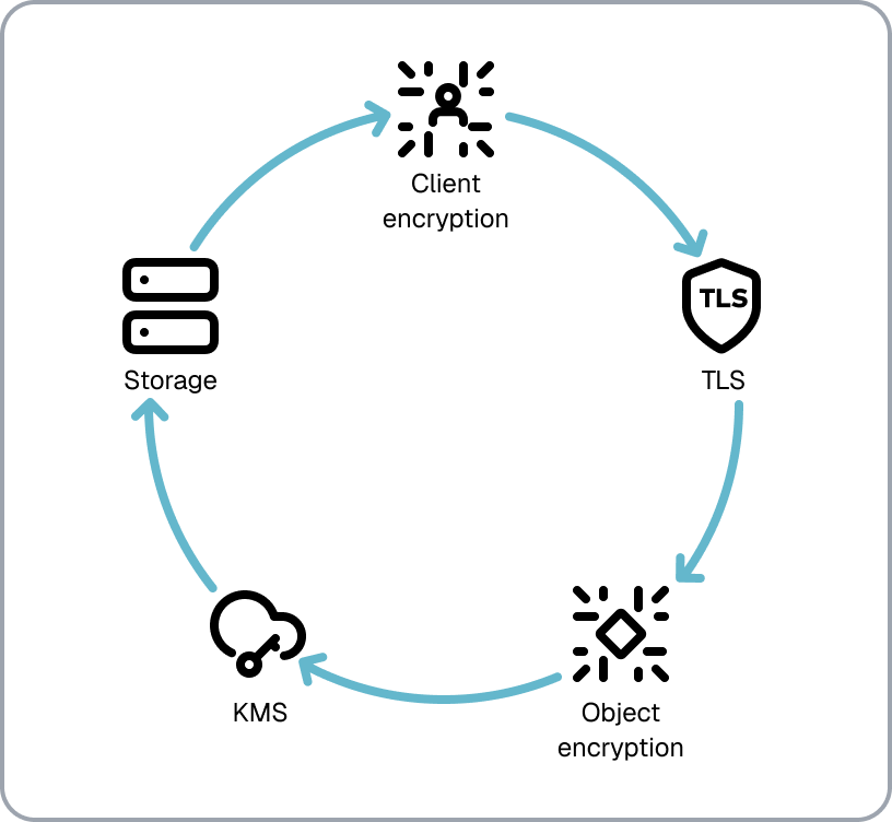 KMS Integration. AIStor works with AWS KMS, HashiCorp Vault, Azure Key Vault, Google Cloud KMS, and AIStor MinKMS. Three server-side encryption modes support different trust models. SSE-KMS provides granular per-bucket or per-object key control for regulated workloads. SSE-S3 simplifies management with a single key across the cluster. SSE-C puts the application in full control, supplying the key per request with AIStor never storing it. Client-side encryption is also supported for data that must remain unreadable outside the application.