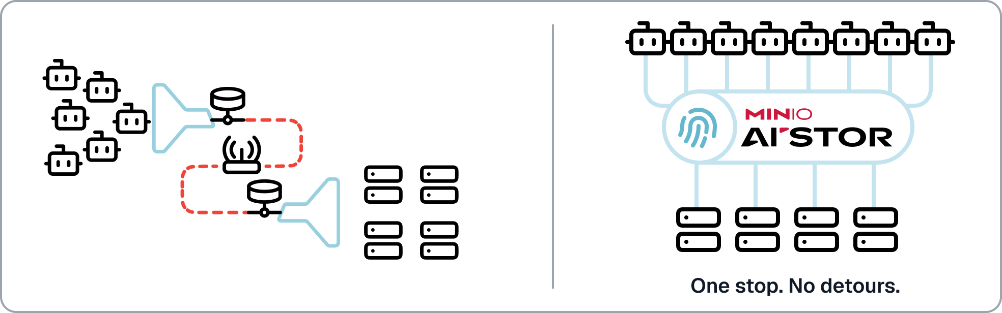AIStor delivers IAM at the storage layer with direct API access. Traditional architectures route identity decisions through external gateways or proxy services that sit between applications and data. Every request adds network hops, translation overhead, and a potential point of failure. When those gateways saturate under load, the entire data pipeline stalls. AIStor eliminates this by handling authentication and authorization natively, at the point where data lives. No proxy delays. No external dependencies in the request path. No bottleneck between your applications and your data.