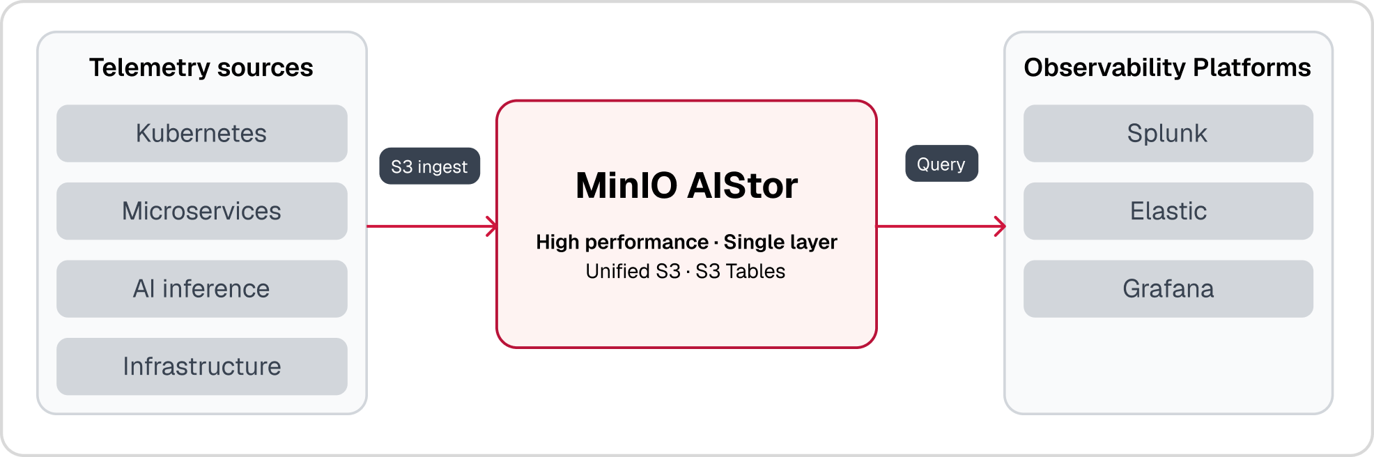 The integration is native. AIStor connects directly to observability platforms via S3 with no custom connectors, no middleware, and no gateway translation. Splunk SmartStore, Elastic Index Lifecycle Management, and Grafana Mimir and Loki all support S3-compatible remote storage, making AIStor a direct drop-in once the S3 endpoint is configured. AIStor serves as the high-performance primary store for observability data, delivering consistent throughput for both real-time alerting and historical queries. With AIStor Tables, structured telemetry data can be queried directly using standard analytics engines, eliminating the need for separate hot, warm, and cold tiers. You search last quarter's logs as fast as yesterday's.