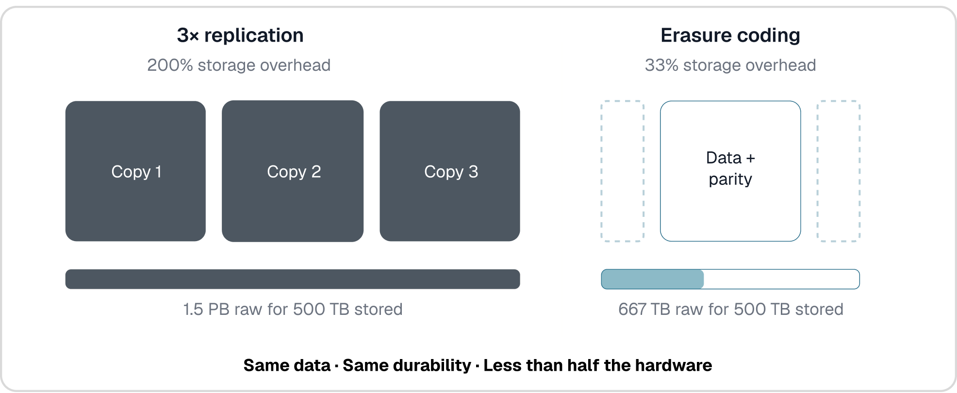 As an example: if your current Splunk or Elastic deployment stores 500TB of telemetry using 3× replication for single-site protection, that consumes 1.5PB of raw capacity. AIStor with erasure coding stores the same 500TB in approximately 667TB. The savings translate directly into longer retention, broader data coverage, or both, without purchasing additional hardware. One of the world's largest content platforms leveraged this exact approach to deploy 38.4PB of usable capacity from 51.2PB of raw storage across just 16 AIStor nodes.